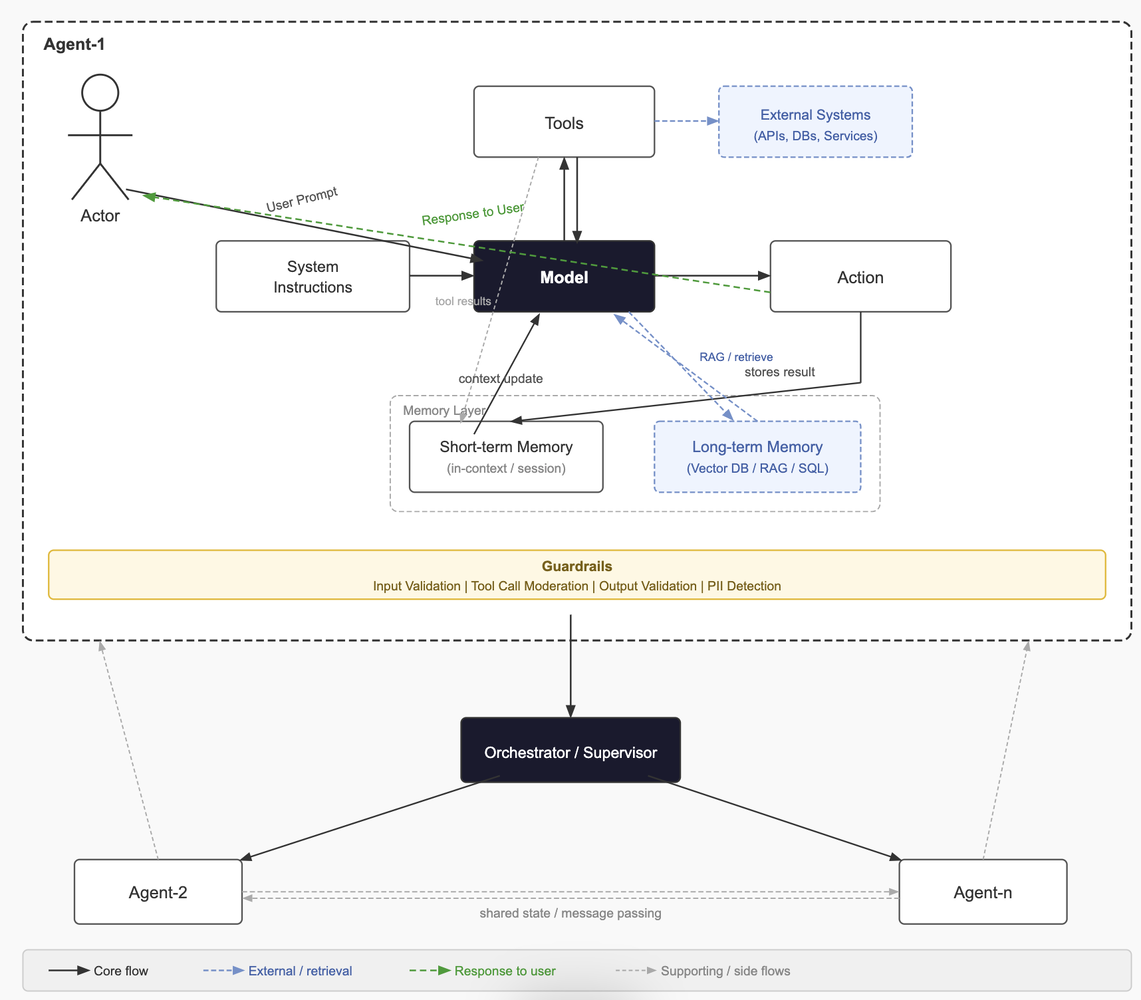 Tools are what give the LLM its ability to act. These are function-calling interfaces the model uses to take actions, whether internal APIs, databases, or external services like Polygon for market data or Stripe for payments. Vague tool definitions are one of the most common reasons agent behaviour goes unpredictable. The flow looks like this: a user prompt hits the instructions layer, the model forms a plan, tools get invoked (sometimes in parallel, sometimes sequentially depending on dependencies), an output or action is produced, and then memory and context get updated, feeding back into the next model plan. Error handling and retry logic inside this loop is critical for anything running in production.