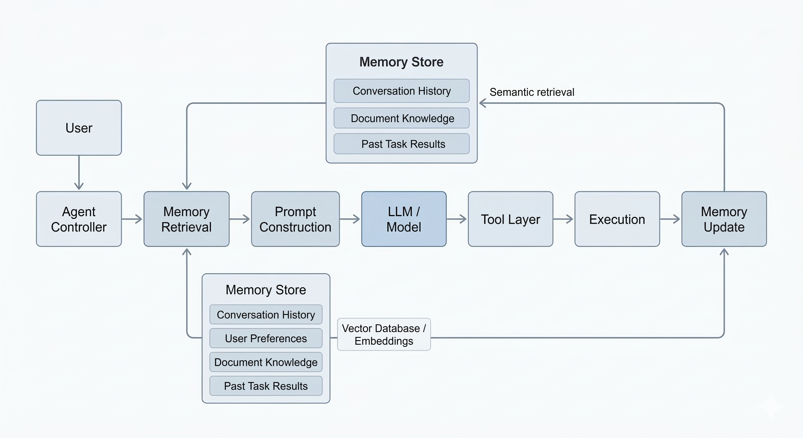 User Request → Query Memory Store → Retrieve Relevant Context → Build Prompt → Model Generates Plan → Tools Execute → New Information Stored in MemoryEach interaction becomes both a read and a write operation. The agent retrieves information that might help answer the request, and it may store new knowledge generated during the task.