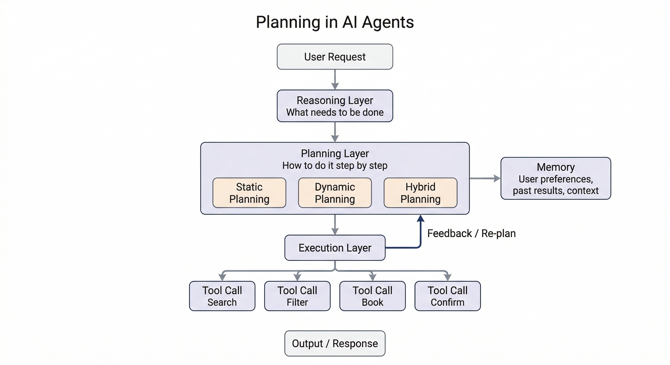 Planning also depends on memory. The agent may need to remember previous user preferences, reuse past results, or maintain context across steps. For example, if the user prefers morning slots, the plan should account for that. Without memory, planning becomes stateless and less useful.