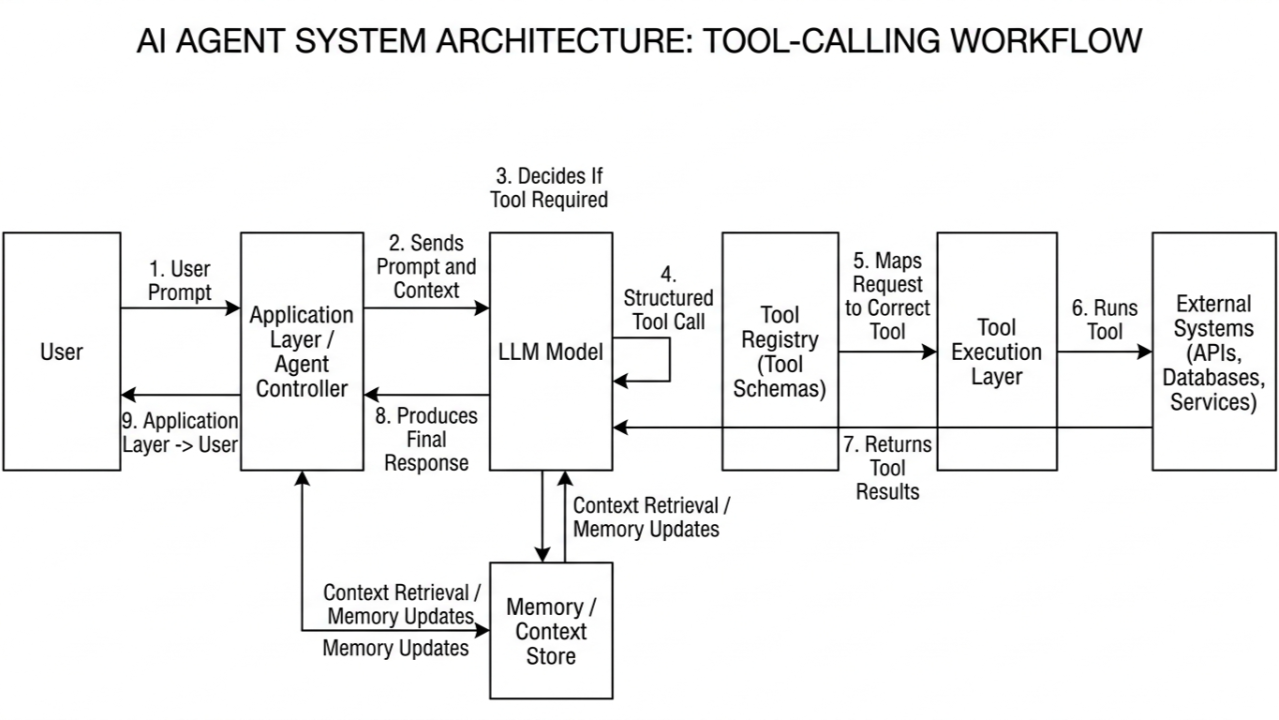 A key component of an AI agent system is the tool layer. Without tools, an agent is just a language model that can generate text. Tools are what allow the model to interact with the outside world. They let an agent query databases, call APIs, trigger workflows, or retrieve information from external systems. In most modern agent architectures, tools are exposed to the model through structured function interfaces. The model does not execute code directly. Instead, it decides which tool to call and produces a structured request that matches the tool's schema. Your application layer then executes that request, returns the result, and the model continues reasoning with the new information.